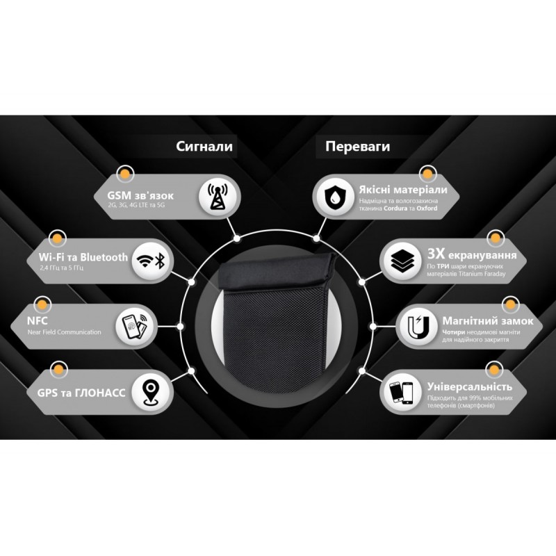 Экранирующий чехол Фарадея изготовлен из прочной ткани Cordura и Oxford черного цвета, которые обеспечивают долговечность, стойкость к повреждениям и влагозащиту. Но главная особенность этого чехла — это его способность глушить все диапазоны частот. Внутри имеется по 3 слоя экранирующих материалов с каждой стороны, включая 2 слоя экранирующей ткани Titanium RFID Faraday с серебряным напылением и медную сетку Фарадея. Благодаря этой комбинации материалов, чехол обеспечивает 100% экранирование всех сигналов, защищая ваш мобильный телефон от несанкционированного доступа и нежелательного слежения.